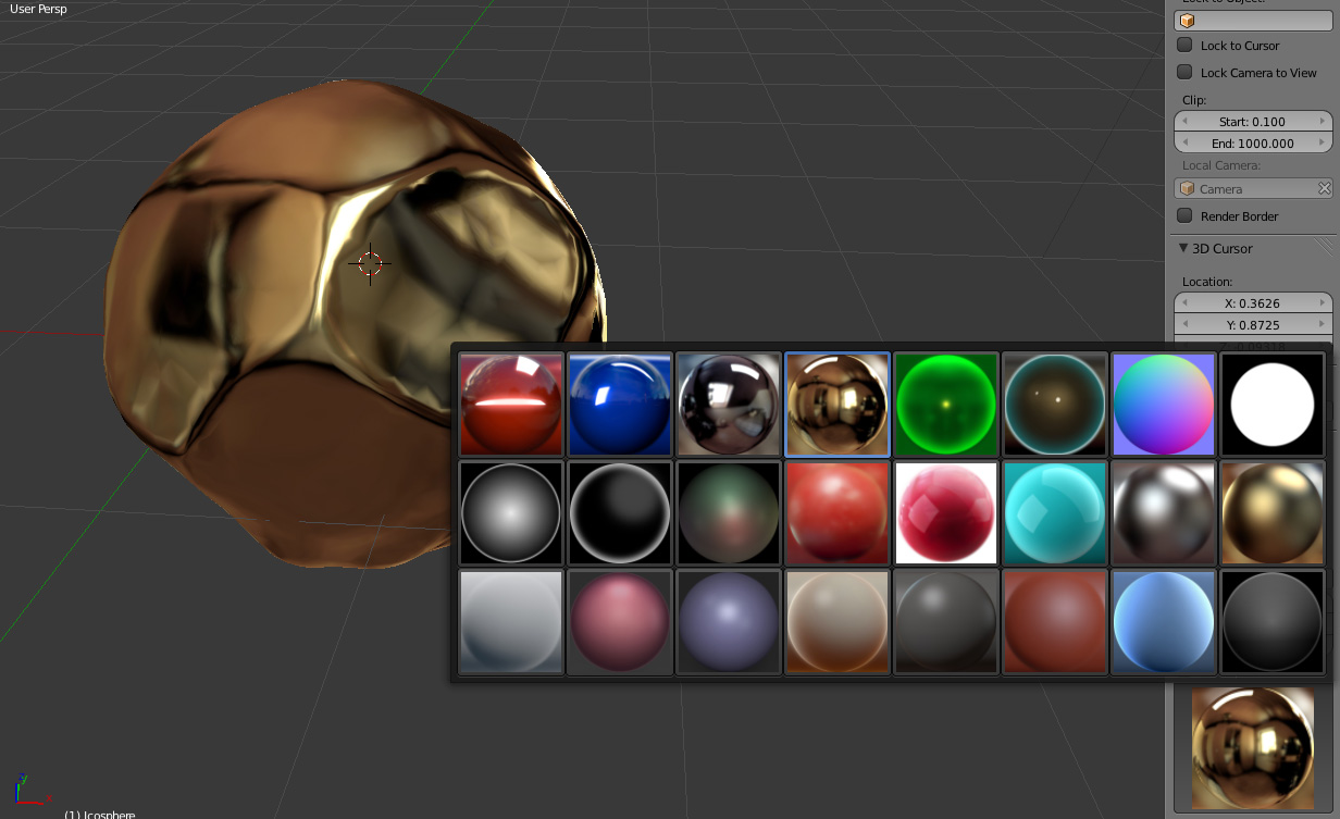 Do sada je jedini način da vidite rezultat podešavanja Cycles materijala bio da se uključi real-time renderovanje scene u 3D prikazu i prate izmene koje se dešavaju na materijalu. Real time renderovanje iole kompleksnijih scena samo radi praćenja malih suptilnih izmena na jednom materijau postajalo je veoma naporno čak i na najbržim CUDA karticama. Sada je to najzad rešeno i unutar materijal editora za Cyceles materijale imamo i “preview” prozor sličan onom koji je korišćen kod materijala Blenderovog internog renderera.